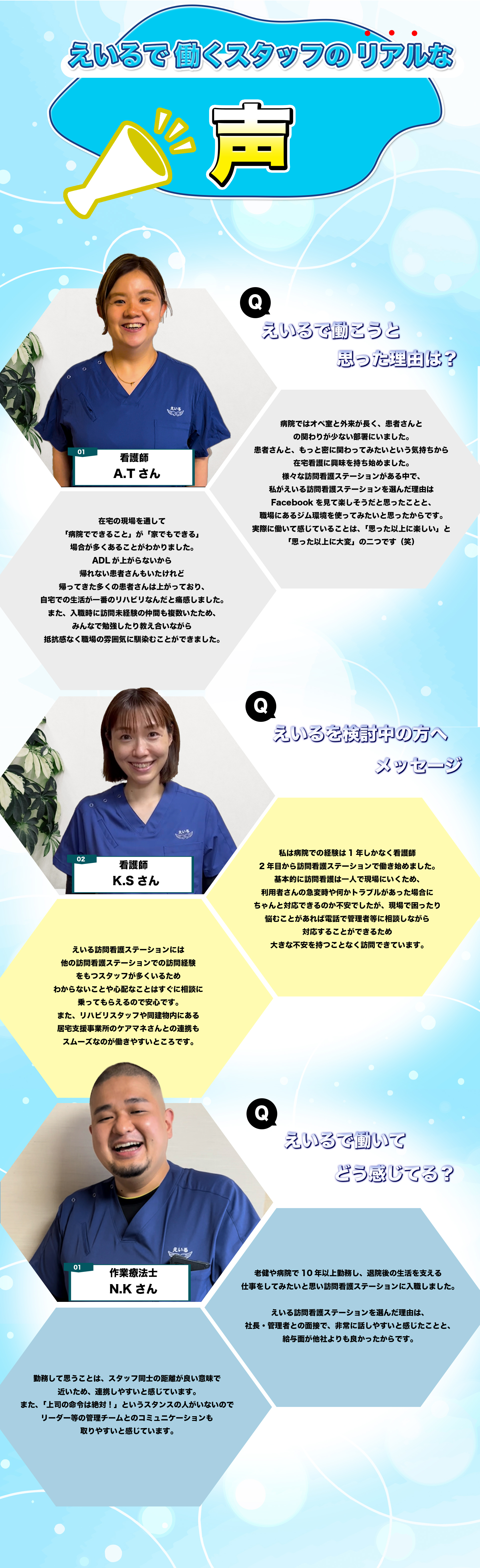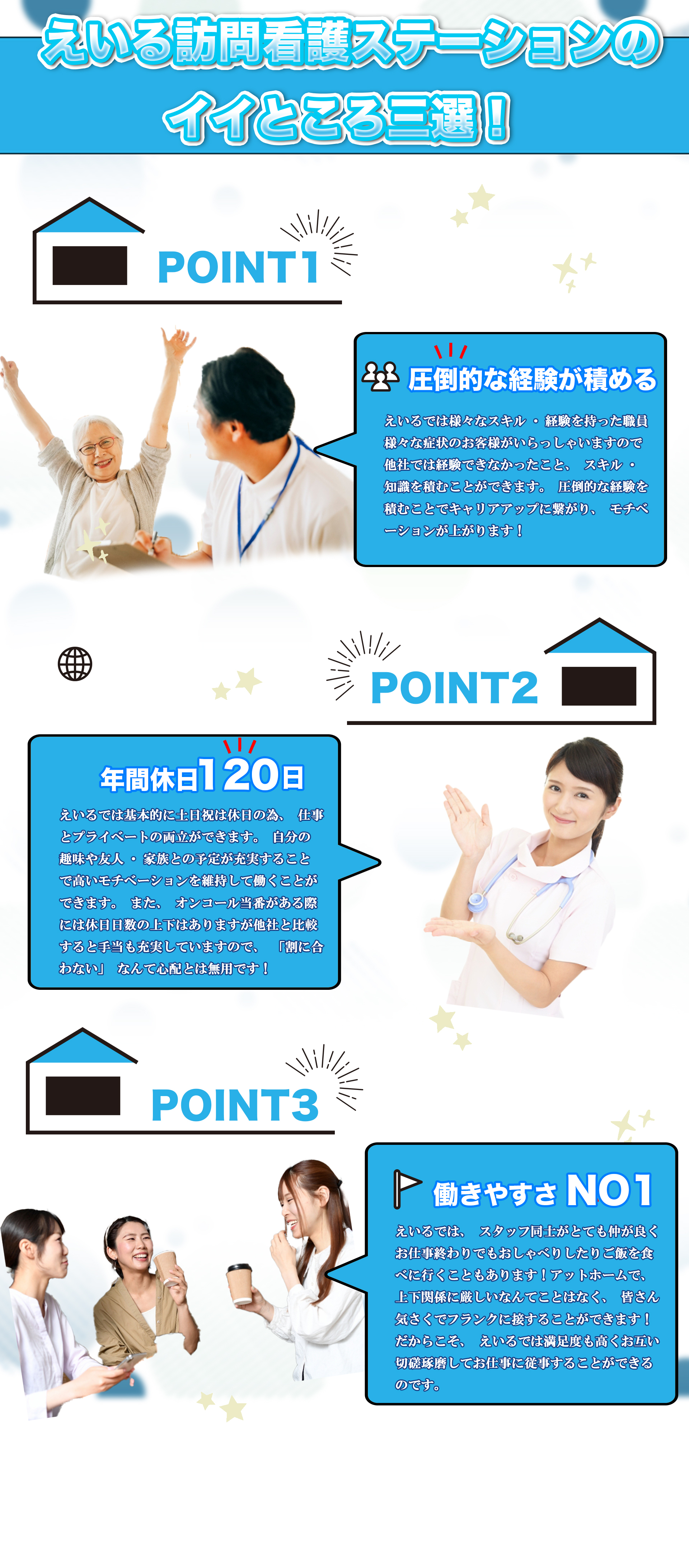 仕事内容 在宅療養中の利用者宅へ訪問しニーズに応じた医療処置や清潔ケア、療養上のサポートを行う
