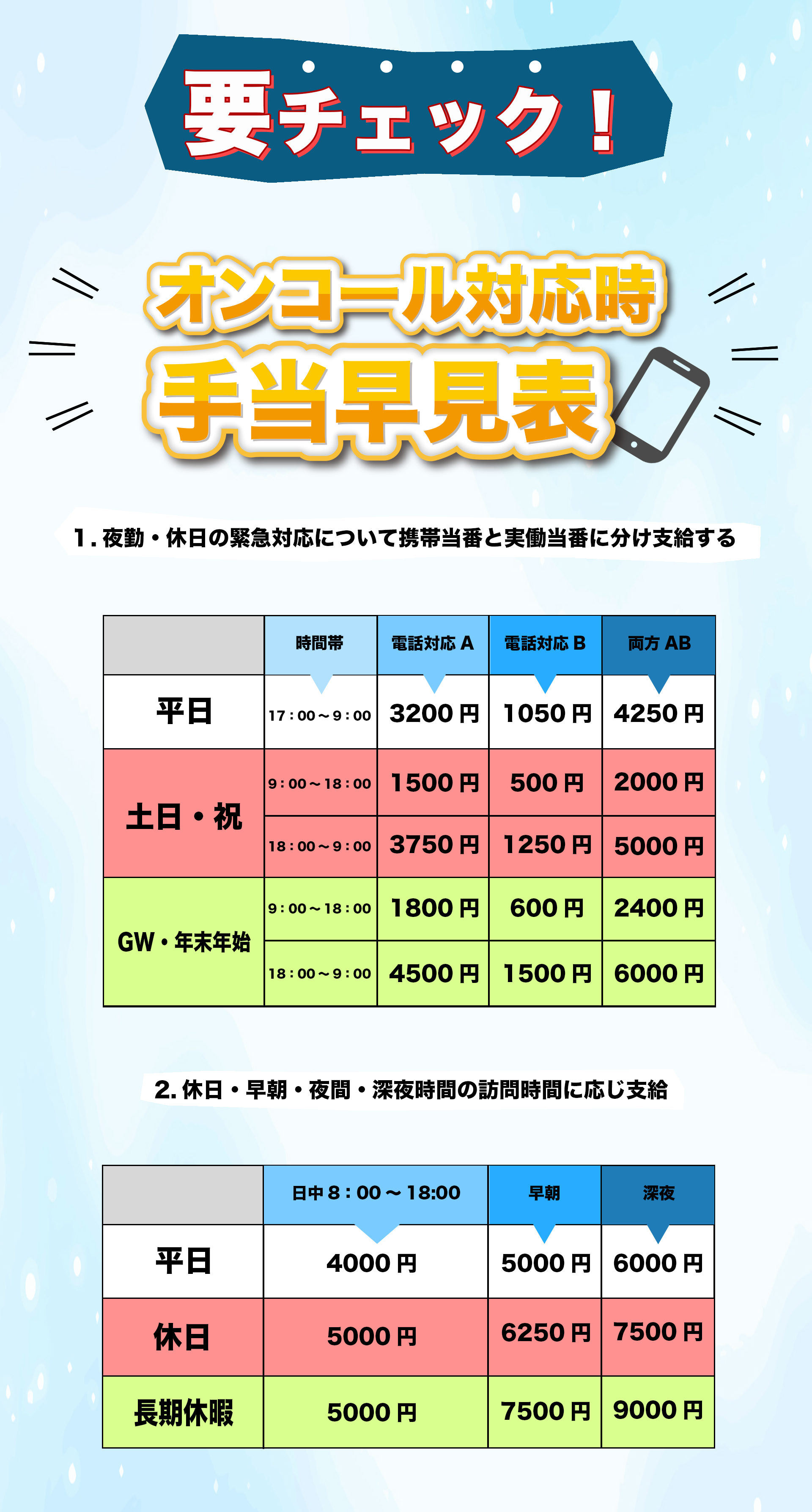 ◆緊急携帯当番手当 3,000円~8,400円 / 1日